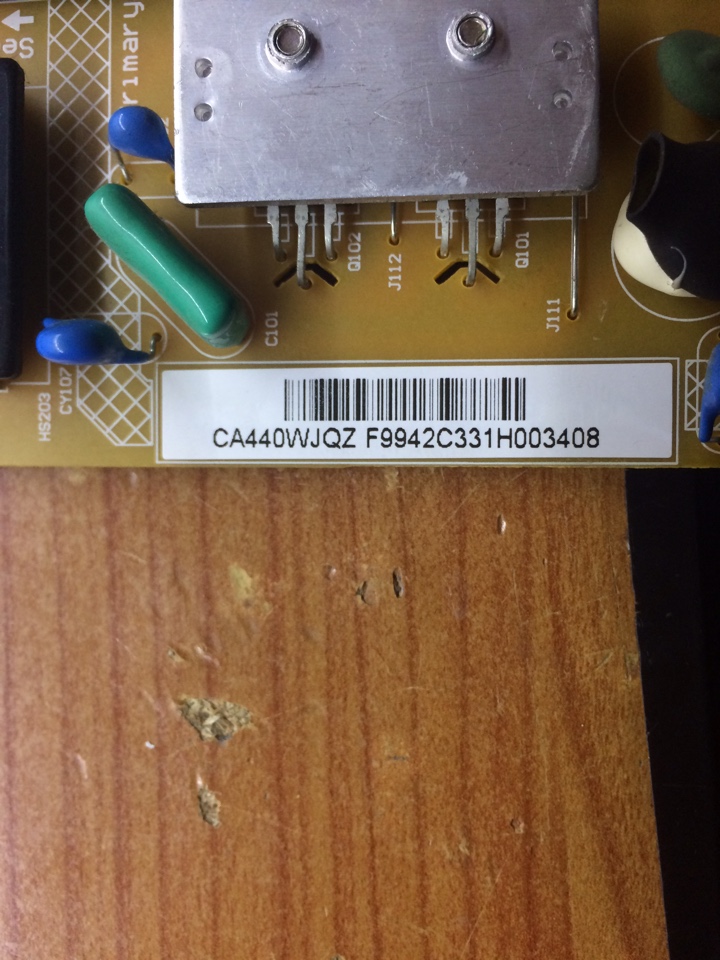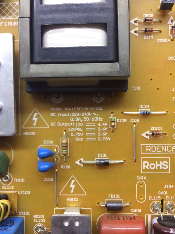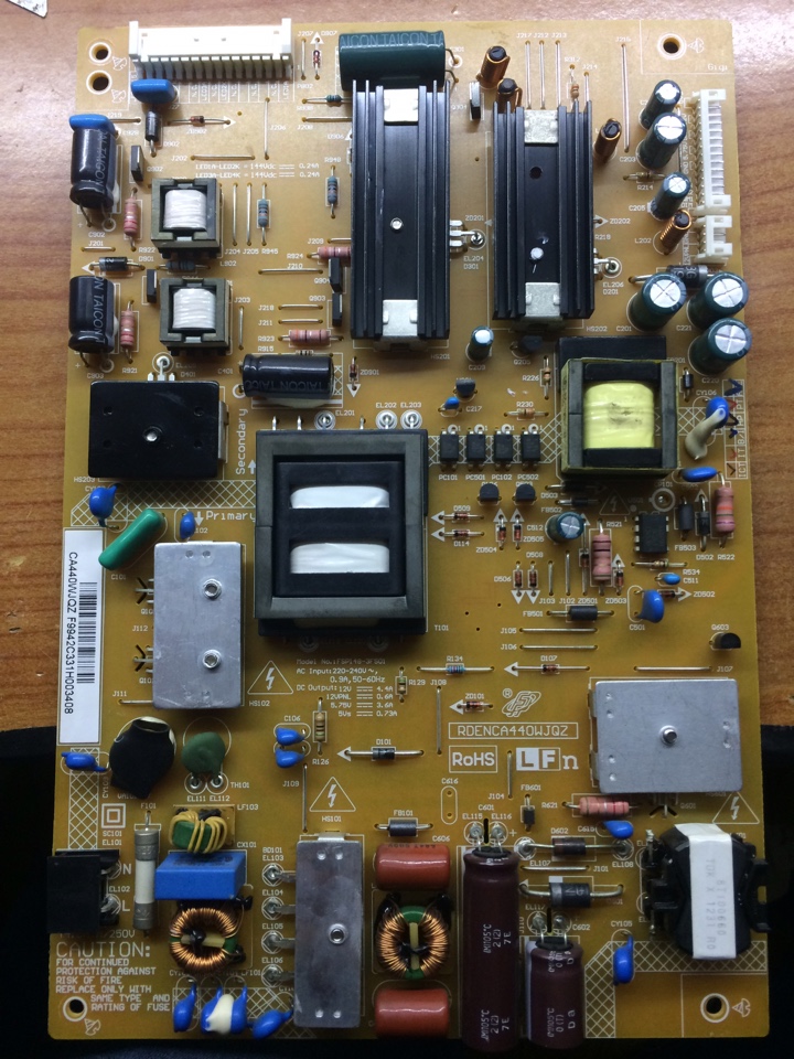 Buonasera amici, ho questa tv della Sharp con un alimentatore probabilmente fuori uso. Appena collegato alla corrente si accende la luce blu di avvio televisore, ma dopo pochi secondi diventa rossa. Verificando le tensioni sull'alimentatore i 5V arrivano mentre i 12v non sono presenti.
