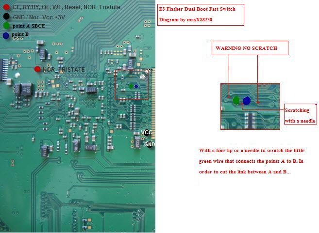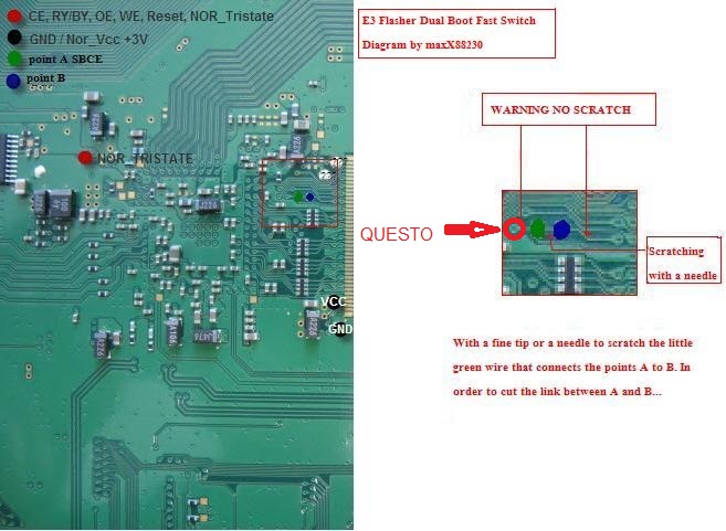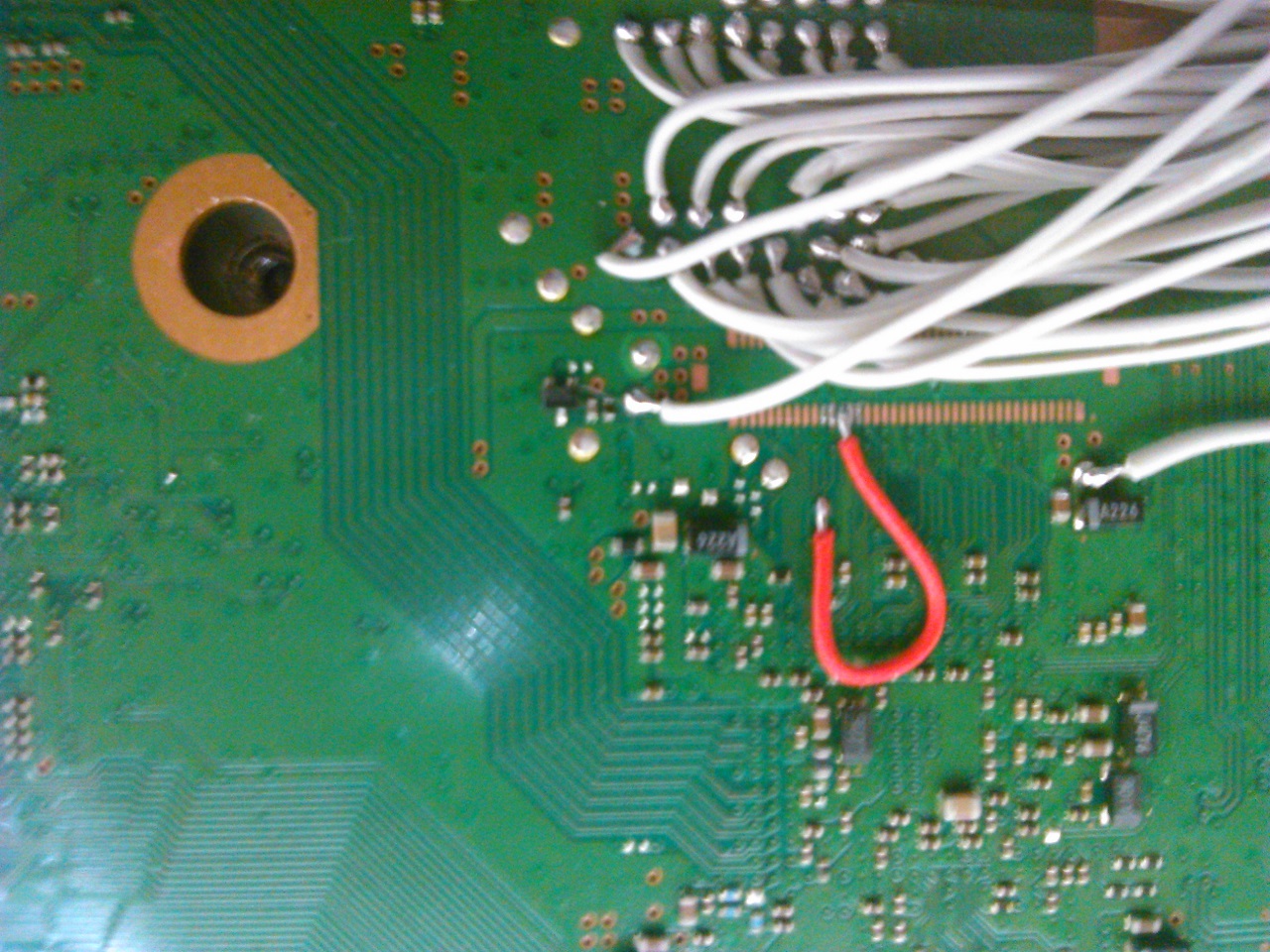 Facendo il bypass quello che vedete in foto col filo rosso, la ps3 fa' il boot...parte normalmente, ma non mi fa' fare ne l'aggiornamento firmware..ne scrivere o leggere la nor...