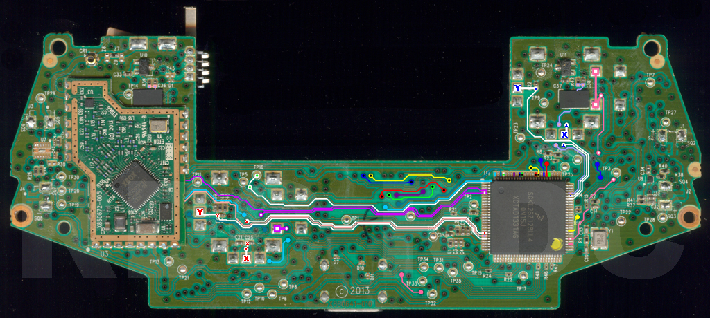 Da quello che la mia mente bacata è riuscita a comprendere, il tutto sembra essere imputato a due sensori di Hall (u10 e u11) che cambiano il voltaggio di uscita in base all'avvicinamento del magnete sulle levette.