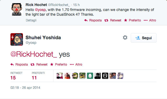 [URL="http://en.wikipedia.org/wiki/Shuhei_Yoshida"]Shuhei Yoshida[/URL], presidente di Sony Computer Entertainment Worldwide Studios (si, ho fatto copia incolla :star: !) ci informa via [URL="https://twitter.com/yosp/status/459984963421491200"]Twitter[/URL] nel nuovo aggiornamento ci sarà finalmente una delle novità più attese ovvero la possibilità di poter regolare l'intensità del led del Dualshock 4 via software, proprio così, moltissimi utenti si sono lamentati che era troppo luminosa, specialmente quando si gioca al buio dava riflesso sulla TV, oltre a questo, impostando la luminosità più bassa del normale si potrà preservare la durata della batteria del controller.