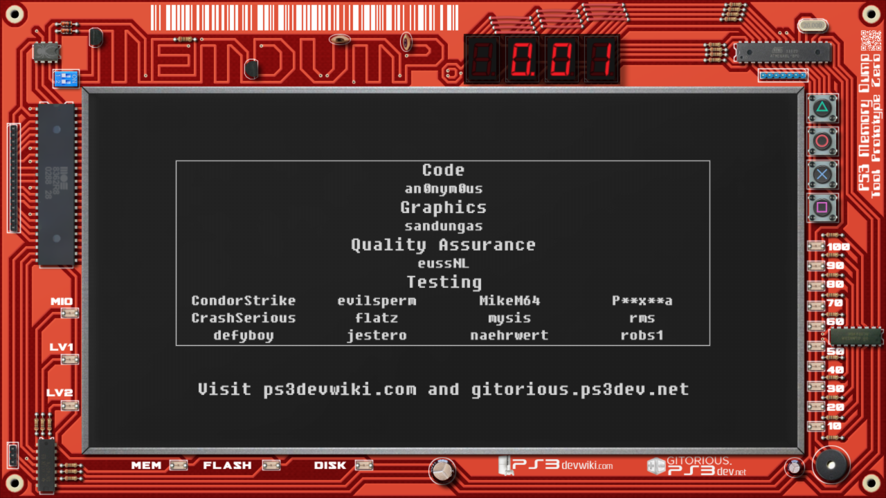 Il developer an0nym0us, ha rilasciato un nuovo tool, memdump v0.01.Questo tool permette di effettuare i seguenti dump dalla stessa interfaccia avviata tramite XMB: Lv1, Lv2, NAND/NOR Flash, e la eEIDB. Purtroppo lavora solo su console con firmware non superiore al 3.55, ma puņ aiutare chi č alla ricerca di una migliore conoscenza dei meccanismi di funzionamento della Ps3.