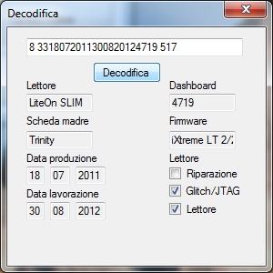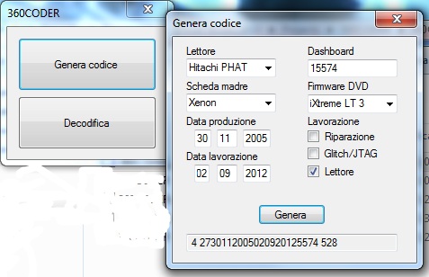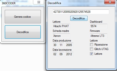 Ciao a tutti, oggi ho creato un'applicazione che potrebbe servire anche ad altri modder.. L'idea mi è venuta perchè oggi uno mi ha portato una 360 dicendomi "l'ho modificata da te ma ora non va più il lettore". Sicuramente questo mi ha preso per scemo dal momento che in quella Xenon quando effettuai la modifica c'era una Samsung e oggi un LiteOn.. Allora ho pensato di creare questo programma che genera un codice per le console che modifico, in base ai dati che inserisco lui genera un codice che può essere decriptato dal programma stesso in un secondo momento per mostrare tutte le info della console.. Vi faccio un esempio: