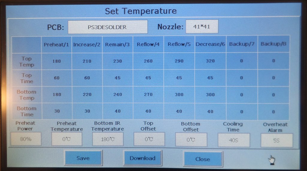 Guarda tommy a mio parere la macchina sembra avere più di qualche problema oltre alla taratura che non ho capito fin a che punto possa incidere il fatto che possa imbarcare le schede madri quelle lunghe tipo xbox e ps3.. perché se la macchina non è tarata e il profilo non arriva a temperatura al massimo o distrugge il bga oppure tale non si stacca ma sempre a mio parere una macchina non tarata non fa imbarcare una scheda madre già a 130/140°.... l'atra cosa che ho notato e confrontato al telefono con altri che hanno la stessa macchina che quando si accende la macchina inizia subito a soffiare aria fredda sia dal bocchettone del top che del bottom... altri che hanno la stessa macchina dicono che solo al top soffia aria fredda ma dal bottom una volta che la macchina ha finito e terminato il profilo l'aria non esce più mentre a me continua sempre ad uscire e non poco soffia di brutto...soffia cosi forte che non riesco nemmeno a pulire la scheda madre perché da sotto arriva sempre aria e il saldatore e stagno non arrivano a temperatura per pulirla la devo togliere dalla macchina e metterla sul bancone....a oggi con tale macchina sono enormemente DELUSO...