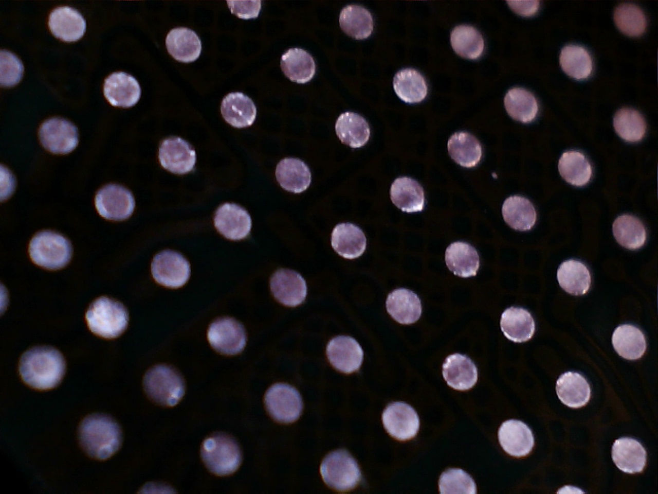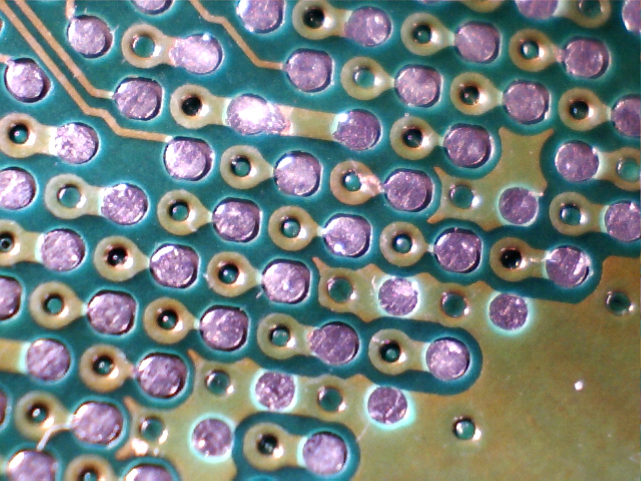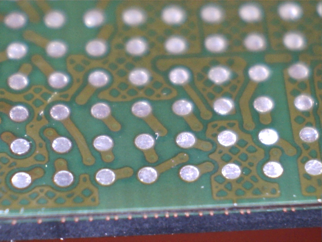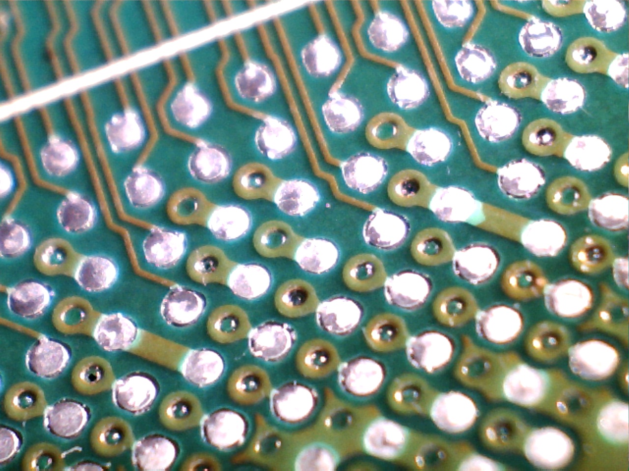 Dalle foto 1 a 6 potete notare in maniera più rilevante come è fatta una piazzola su una scheda madre. La piazzola in metallo ha un margine sottile nella circonferenza interna dove non c'è ne metallo e ne solder masck. La vernice applicata fa un piccolo spessore mentre la piazzola che non è stata verniciata rimane giu. In quieste foto ho pulito la mobo con una spatola in silicone.