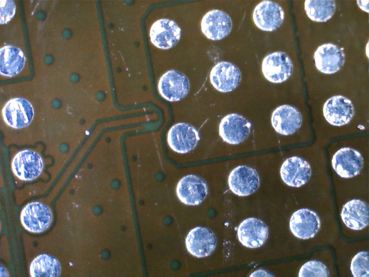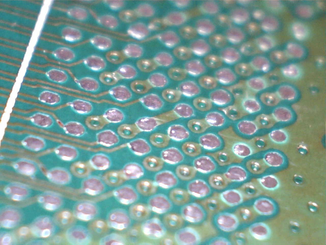 la pulizia è ottima, mi raccomando metti flussante la giustà quantità, non abbondare che non ha senso. Metallizza prima di pulire con la trecciola con è pallozze di piombo se reballi al piombo cosi mischi il rimanente della lega e pulisci meglio le piazzole dopo. Le sferette non si sono saldate forse per 2 motivi e sono: