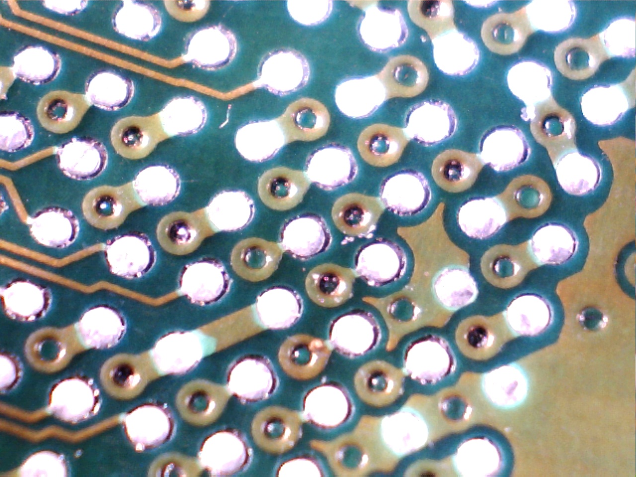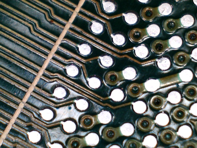 Dalle foto 1 a 6 potete notare in maniera più rilevante come è fatta una piazzola su una scheda madre. La piazzola in metallo ha un margine sottile nella circonferenza interna dove non c'è ne metallo e ne solder masck. La vernice applicata fa un piccolo spessore mentre la piazzola che non è stata verniciata rimane giu. In quieste foto ho pulito la mobo con una spatola in silicone.