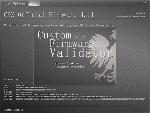 Custom Firmware Validator is a program designed mainly for veryfing downloaded or manually patched firmwares for PS3. This aplication compares checksums from the database with those which are being calculated on the currently open file. If at least one would match, the following things will appear: the name of the firware and its short description, the option to show the list of additional functions and the option to visit the author's webpage, also one could copy a file onto USB with the proper directory stuctrure and its name (PS3, PSP, PSV).