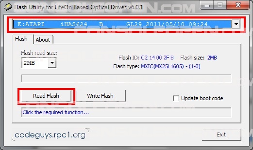 Lanciamo ora il programma Flash_utility, anche qui assicuriamo che sia selezionata l'unità corretta , e clicchiamo su read flash: