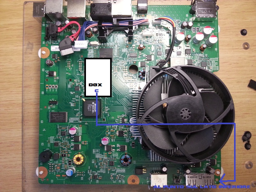 come lunghezza del POSTOUT (Punto C del DGX) e di farlo passare sopra la ventola della console come in figura sottostante.