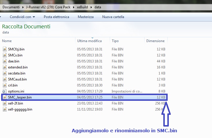 Adesso spostiamoci nella cartella Data, contenuta a sua volta nella cartella Xebuild di J-runner ed aggiungiamoci l'SMC del tipo della nostra motherboard, prelevandolo dall'archivio che abbiamo appena scaricato (SMC_PACK.rar), rinominandolo semplicemente SMC.bin