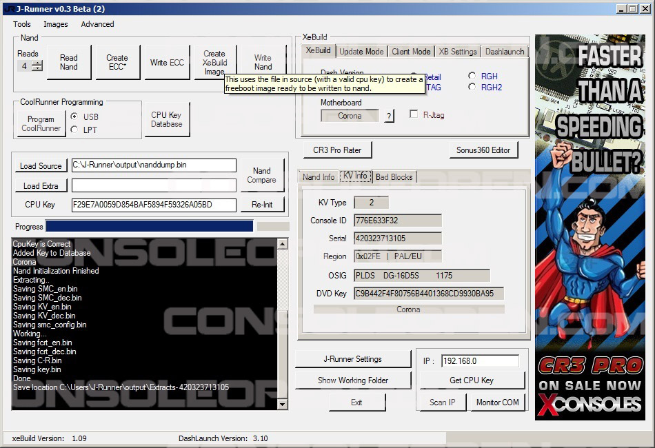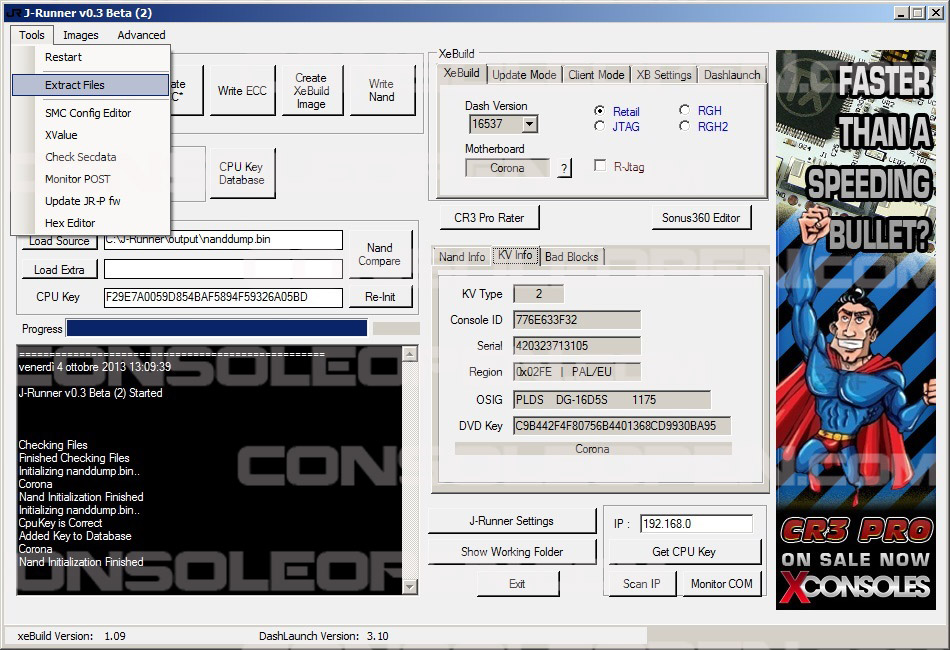 Una volta che abbiamo ottenuto la cpu key univoca necessaria per decriptare la nand estraiamo tramite il software J-Runner i file KEY.BIN e C-R.BIN necessari per creare il custom firmware.