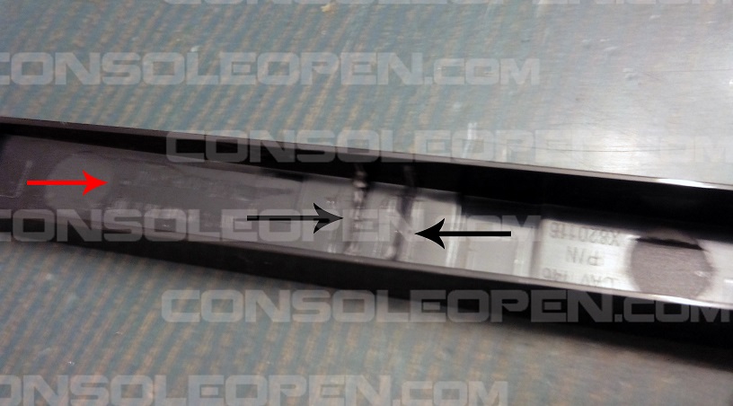 Dopo aver tagliato le due sporgenze indicate dalle frecce nere,mettiamo un piccolo spessore nel punto indicato dalla freccia rossa e attaccate la faceplate al lettore con della colla a caldo: