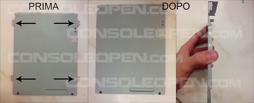 Una volta ottenuti questi file, oltre a programmare il lettore 16D2S col custom firmware, dobbiamo andare a modificare fisicamente il lettore per poterlo fare entrare nell'alloggiamento delle console slim, rimuovendo i 4 piedini di plastica e tagliando le sporgenze relative dal case metallico. Una volta fatto il case non potrà più essere chiuso con le sue viti e andrà quindi fissato con del nastro adesivo.