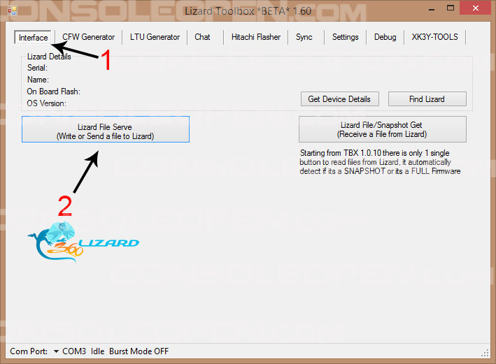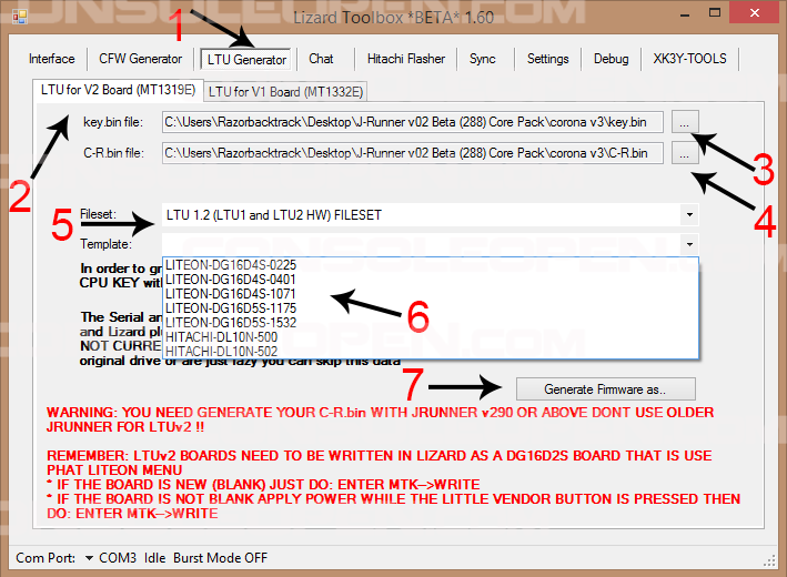 Avviamo il Lizard Toolbox ed eseguiamo i passaggi in figura per creare il nostro CFW (N.B. Nel punto 6 dovrete selezionare il modello del lettore originale):