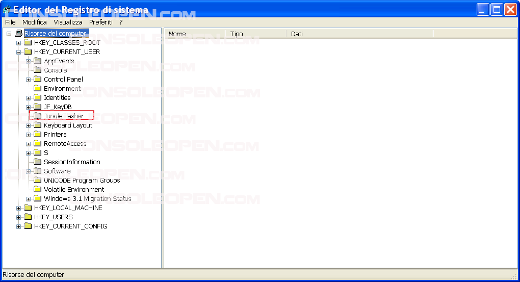 selezionare START,ESEGUI,nel campo APRI digitare Regedit e premere OK