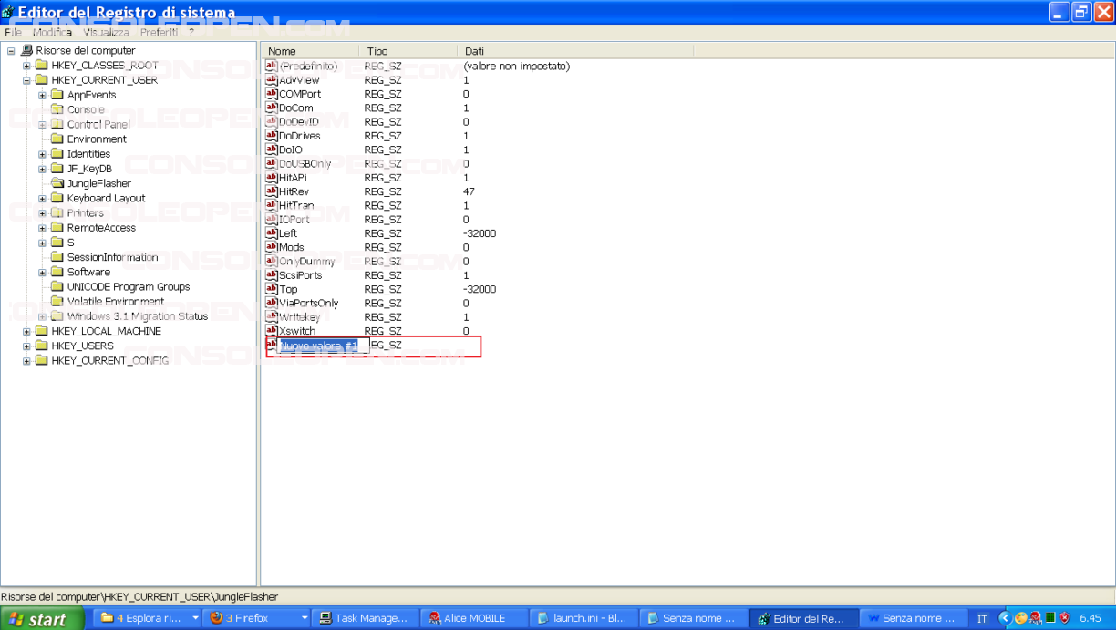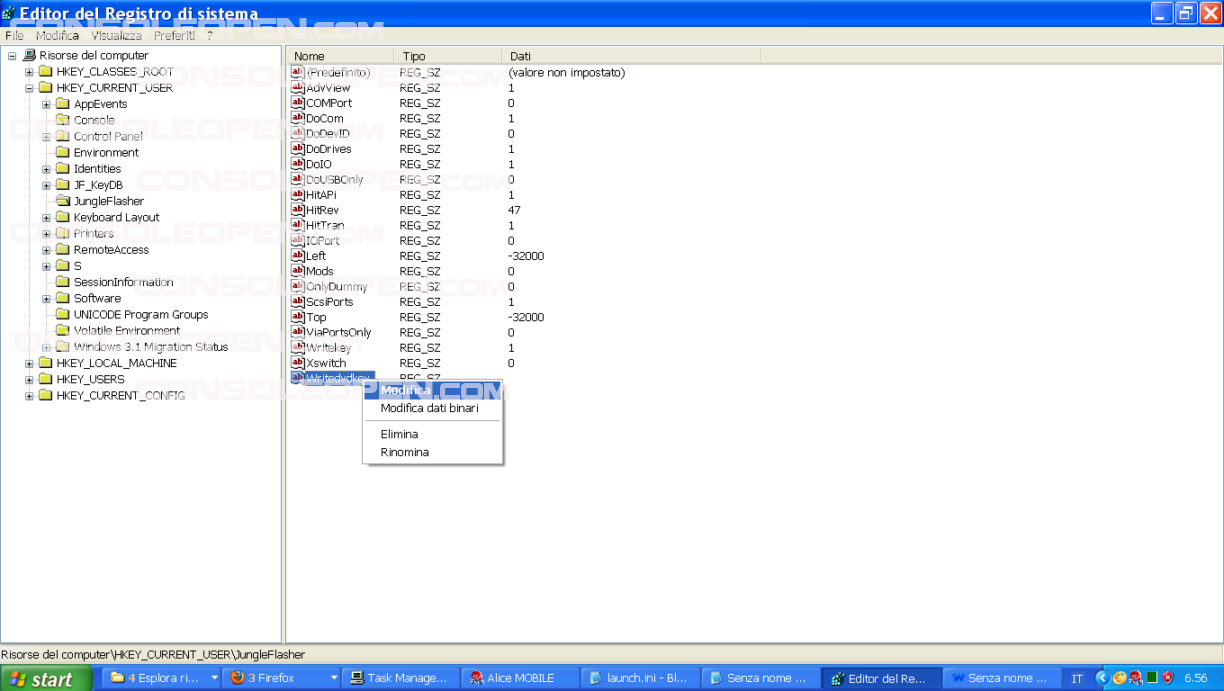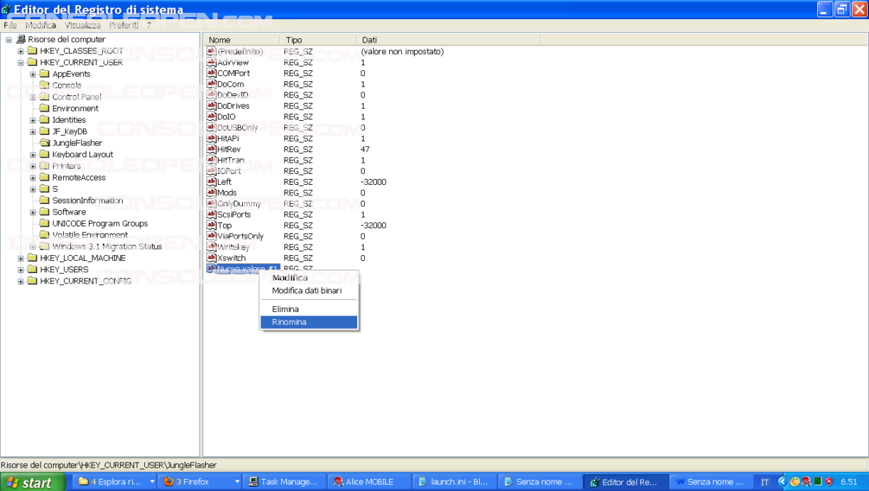 In Firmware Tool 32,nel tab TARGET,clicchiamo col tasto destro del mouse e selezioniamo WRITEKEY(valore aggiunto prima nel registro di configurazione)