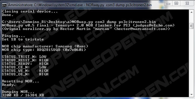 - appena finito il primo Dump eseguite una seconda lettura... una volta completata diamo il comando NORway.py COMx release e spegnete la Ps3.