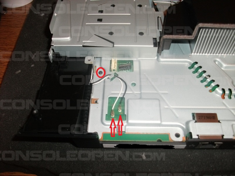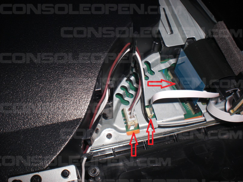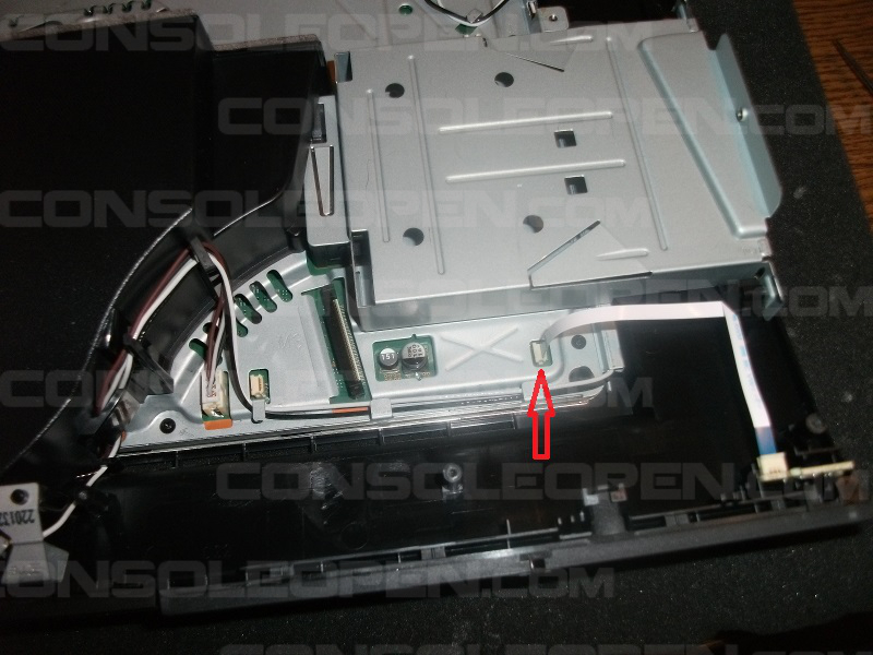 A questo punto, procediamo rimuovendo alcuni connettori all'interno della console. Localizziamo il connettore della ventola, il FFC a 60 pin del lettore blu ray e il piccolo FFC per la gestione del coperchio e rimuoviamoli.