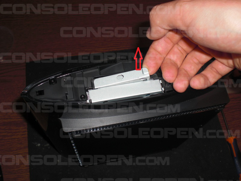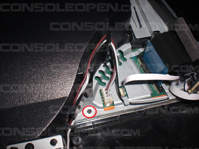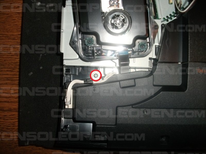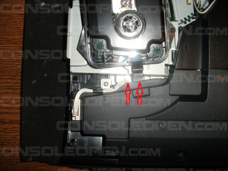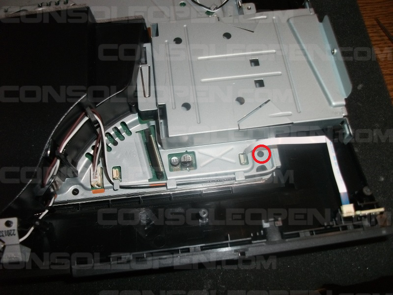 Adesso spostiamo la meccanica del lettore verso la parte anteriore della console, leggermente, solo per scoprire il FFC posteriore dell'alimentazione del lettore e il connettore dell'alimentatore generale della console, che ovviamente andremo a staccare. Ora possiamo rimuovere il lettore blu ray.