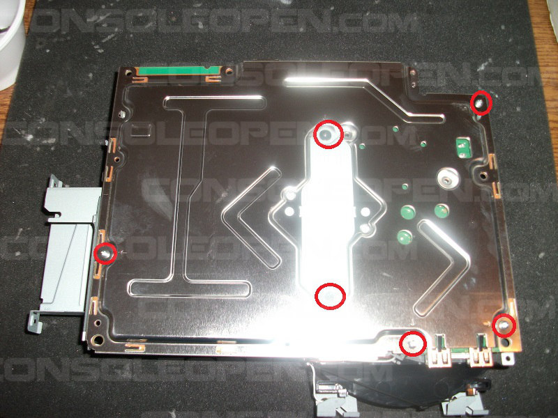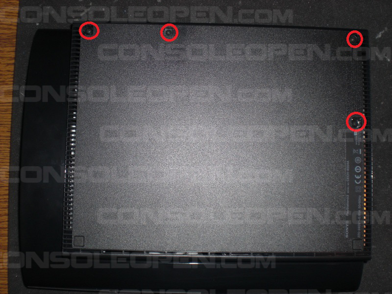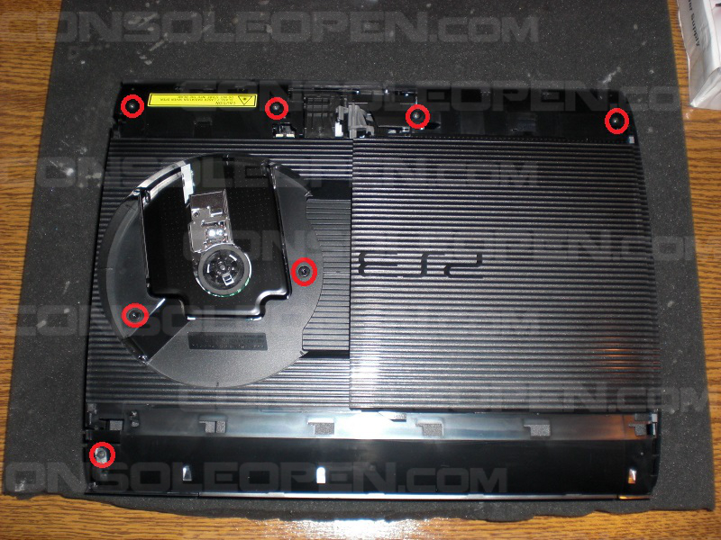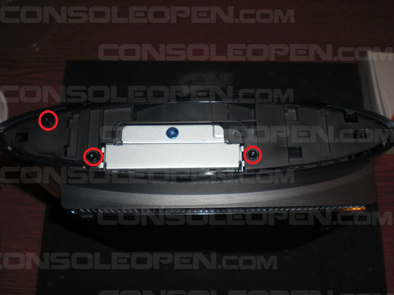 Fatto questo, la console ci mostrerà le viti che andranno svitate. Aiutiamoci con la figura sottostante per capire quali viti andranno svitate. Ce ne sono 4 a stella sotto la placca frontale, una sempre a stella sotto la placca posteriore e 2 viti Torx 9 a lato del lettore blu ray (apriamo il coperchio per notarle).