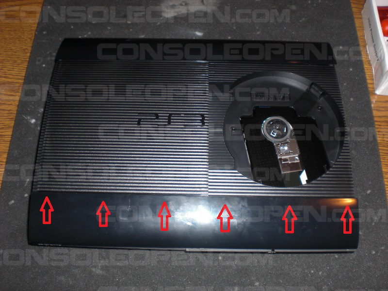 Portiamo la console in posizione orizzontale classica e ora dovremo rimuovere le due lunghe placche nere di plastica, situate una davanti e una dietro alla console.