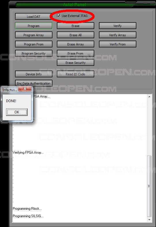8. Spuntiamo la voce "Use External Jtag" , premiamo "load DAT" per caricare i bitstream , infine il tasto "Program" e attendiamo qualche minuto per il completamento dell'operazione