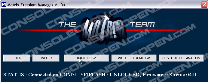 Avendo già flashato il drive con il Fw corretto, il programma del Team Matrix preleverà in automatico la key presente nella EEPROM e vi permetterà di switchare velocemente tra un il Firmware Originale e quello iXtreme.Non dovrete neppure preoccuparvi dello stato di Lock/Slock del lettore dal momento che sia in fase di Backup Fw, che di Flash, il programma effettuerà automaticamente tutti i passaggi necessari alla corretta riuscita dell'operazione.Ecco come si presenta il programma una volta avviato: