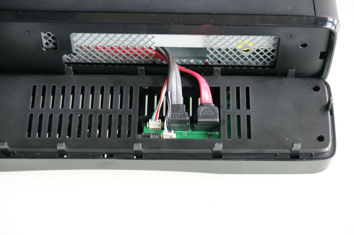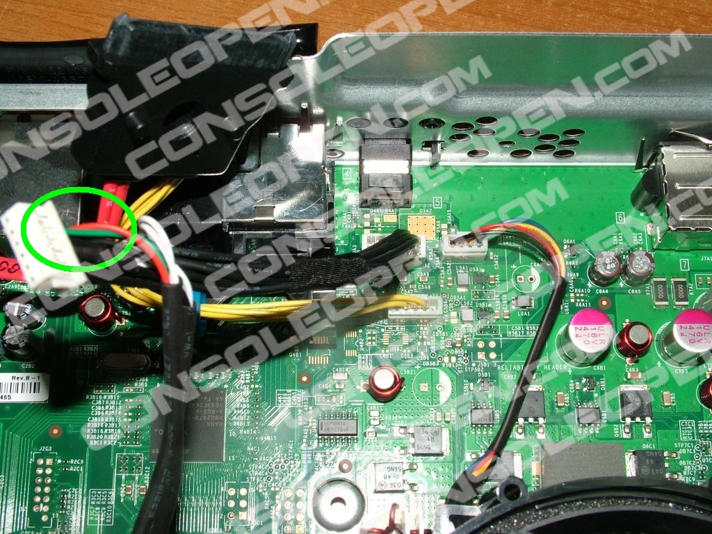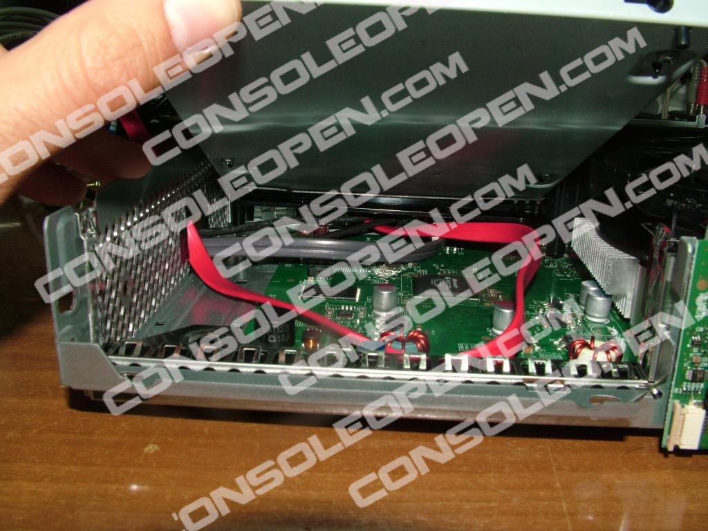 Una volta rimosso il sostegno dell'HDD, si deve scollegare il cavo di alimentazione del lettore della Xbox per poter collegare quello del Wasabi.