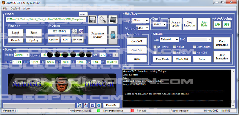 Dopo aver preso la cpukey tramite lan, questa compare nell'apposito campo. Il programma effettua il decrypt della nand originale. Poi cliccate su Crea Immagine ed aspettate che il programma finisca. Poi cliccate su Flash immagine per scrivere freeboot sulla nand secondaria.