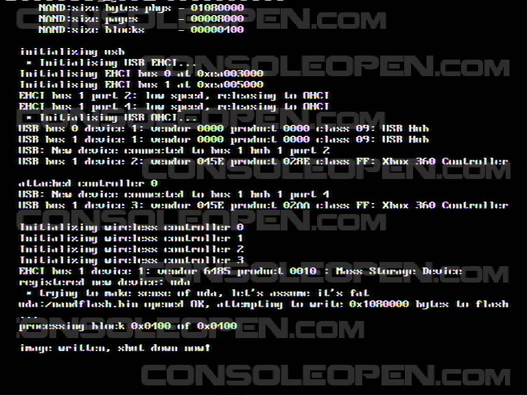 Ora il dispositivo è pronto, colleghiamo la pendrive alla console da aggiornare ed accendiamola con il tasto eject x avviare Xell ed attendiamo la fine del processo di scrittura